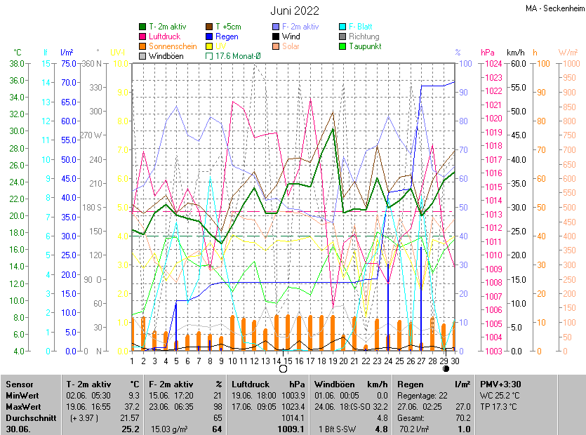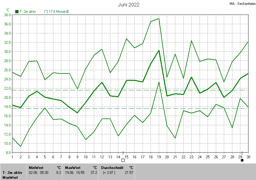 Der wärmste Tag war der 19.06.2022 um 16:55 mit 37.2°C. Am kältesten war es mit 9.3°C am 02.06.2022 um 05:30.
