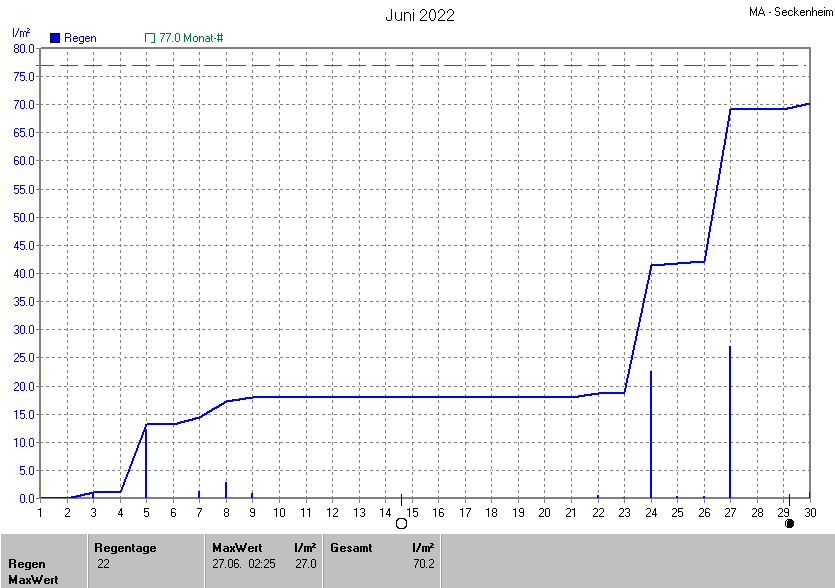Die gesamte Regenmenge lag bei 70.2l/m² (entspricht: 91.2%) und war damit um -6.8l/m² vom langjährigen Wert entfernt. Niederschlag gab es an 12Tagen. Mehr als 2mm Regen gab es an 4Tagen. Sehr viel Regen mit mehr als 20mm pro Tag gab es an 2Tagen.