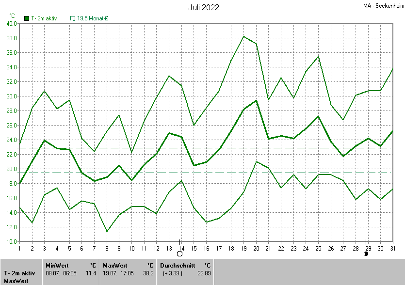 Der wärmste Tag war der 19.07.2022 um 17:05 mit 38.2°C. Am kältesten war es mit 11.4°C am 08.07.2022 um 06:05.
