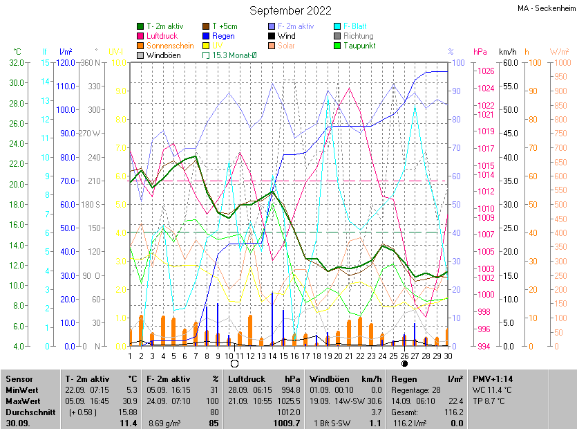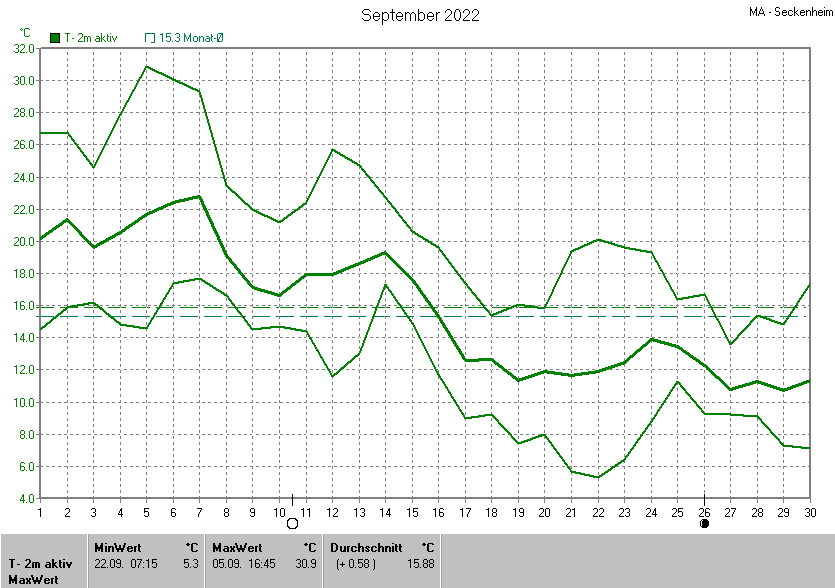 Die Durchschnittstemperatur für den Monat September 2022 lag bei 15.89°C. Die Abweichung vom langjährigen Mittel war +0.59°C.