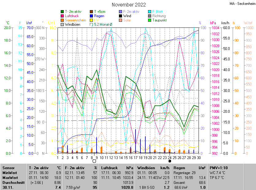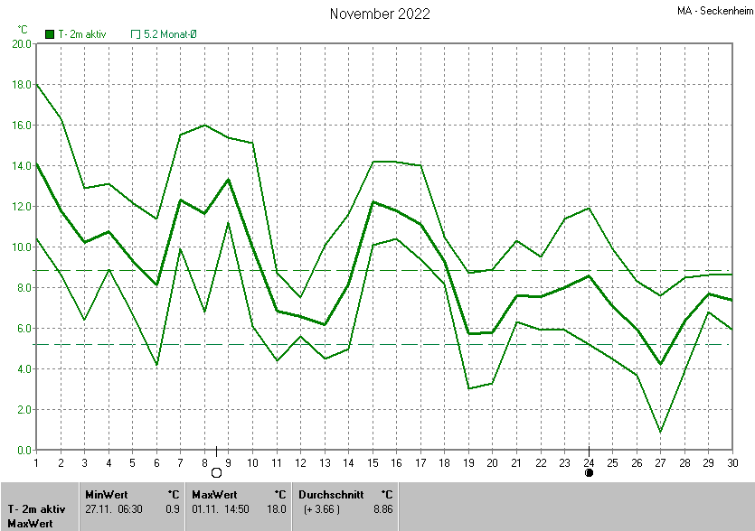 Die Durchschnittstemperatur für den Monat November 2022 lag bei 8.86°C. Die Abweichung vom langjährigen Mittel war +3.66°C.