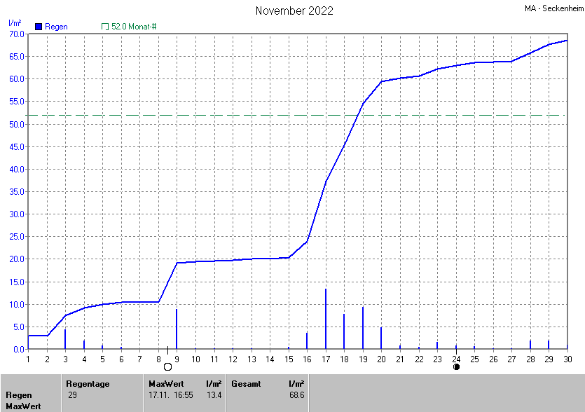 Die gesamte Regenmenge lag bei 68.6l/m² (entspricht: 131.9%) und war damit um +16.6l/m² vom langjährigen Wert entfernt. Niederschlag gab es an 26Tagen. Mehr als 2mm Regen gab es an 8Tagen. Sehr viel Regen mit mehr als 20mm pro Tag gab es an 0Tagen.