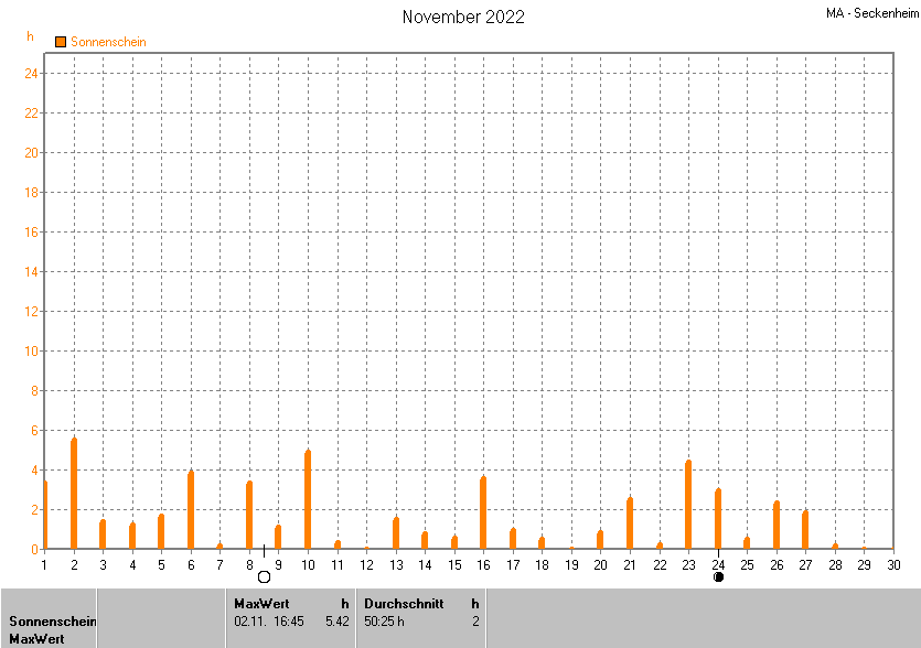 Dargestellt wird die grafische Übersicht für die Sonnenscheinzeit. Zu sehen sind immer die täglichen Sonnenstunden (von 0-24 Uhr):