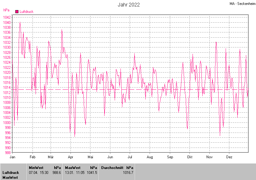 Am wärmsten war es am 04.08.2022 um 17:05 mit 38.6°C. Am kältesten mit -9.0°C am 17.12.2022 um 07:25.