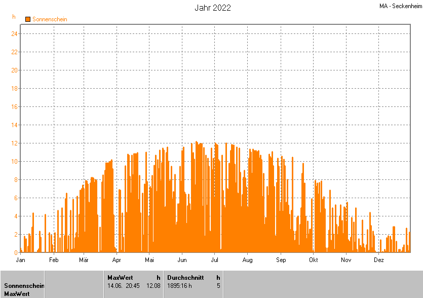 Dargestellt wird die grafische Übersicht für die Sonnenscheinzeit. Zu sehen sind immer die täglichen Zeiten (von 0-24 Uhr):