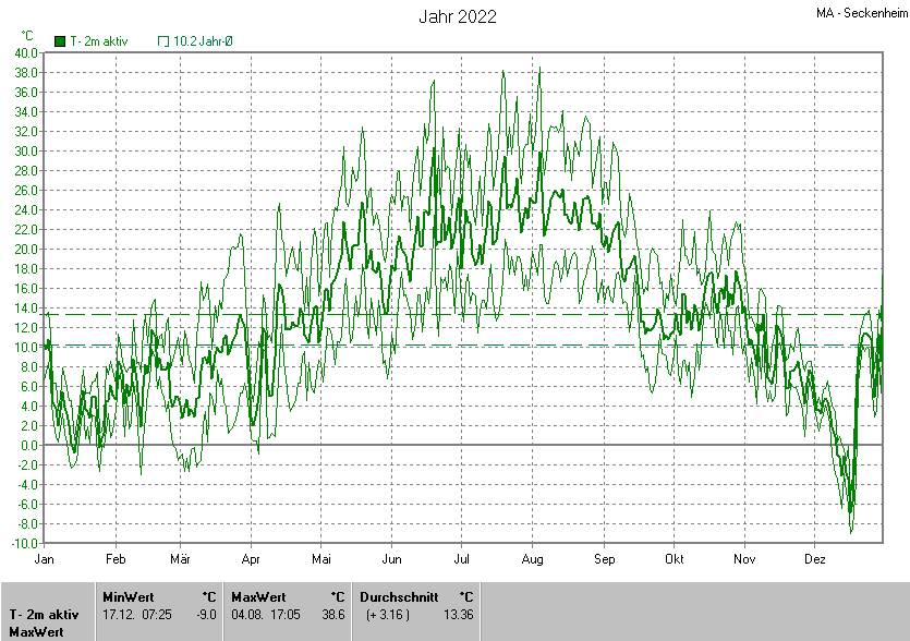 Die Durchschnittstemperatur für das Jahr 2022 lag bei 13.36°C. Die Abweichung vom langjährigen Mittel war +3.16°C.