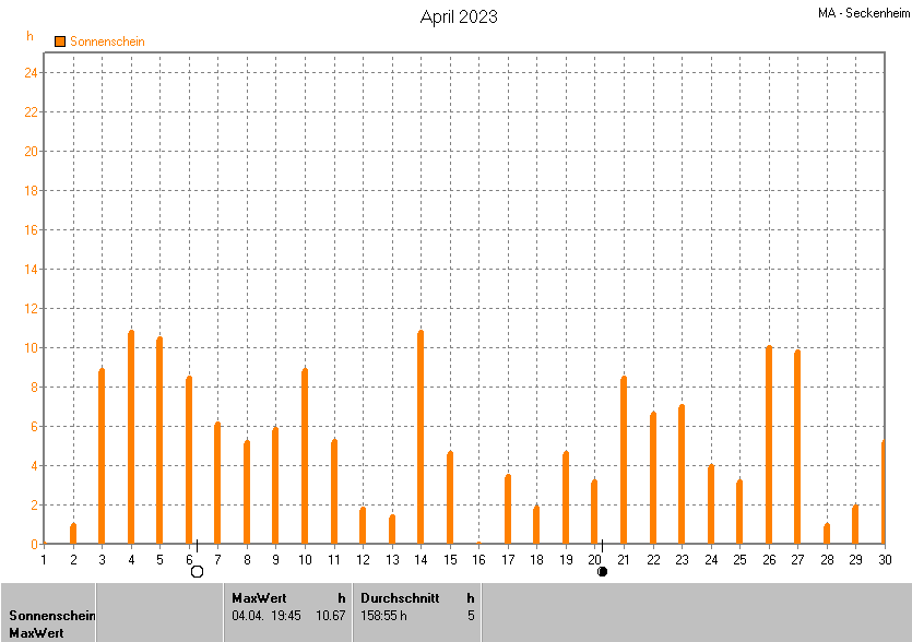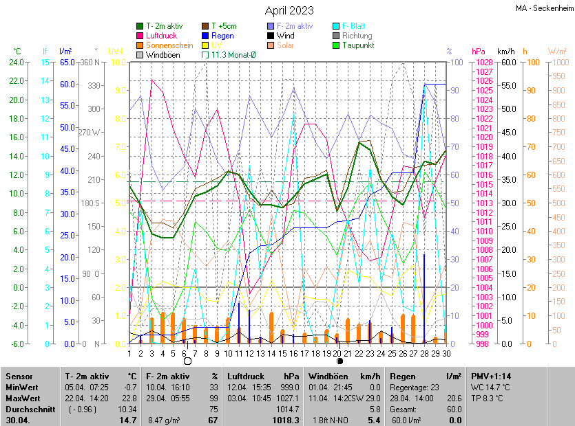 Die Durchschnittstemperatur für den Monat April 2023 lag bei 10.34°C. Die Abweichung vom langjährigen Mittel war -0.96°C.