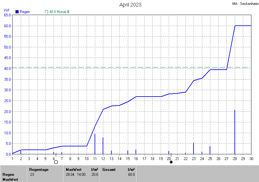Die gesamte Regenmenge lag bei 60.0l/m² (entspricht: 147.8%) und war damit um +19.4l/m² vom langjährigen Wert entfernt. Niederschlag gab es an 17Tagen. Mehr als 2mm Regen gab es an 6Tagen. Sehr viel Regen mit mehr als 20mm pro Tag gab es an 1Tagen.