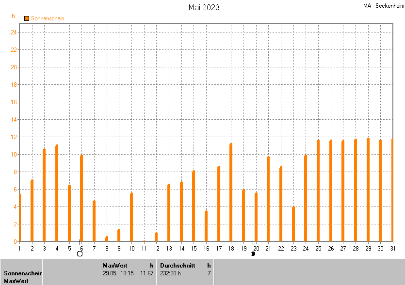 Die gesamte Sonnenscheinzeit lag bei 232:20 Stunden (entspricht: 107.1%) und war damit um +15:20h vom langjährigen Wert entfernt.