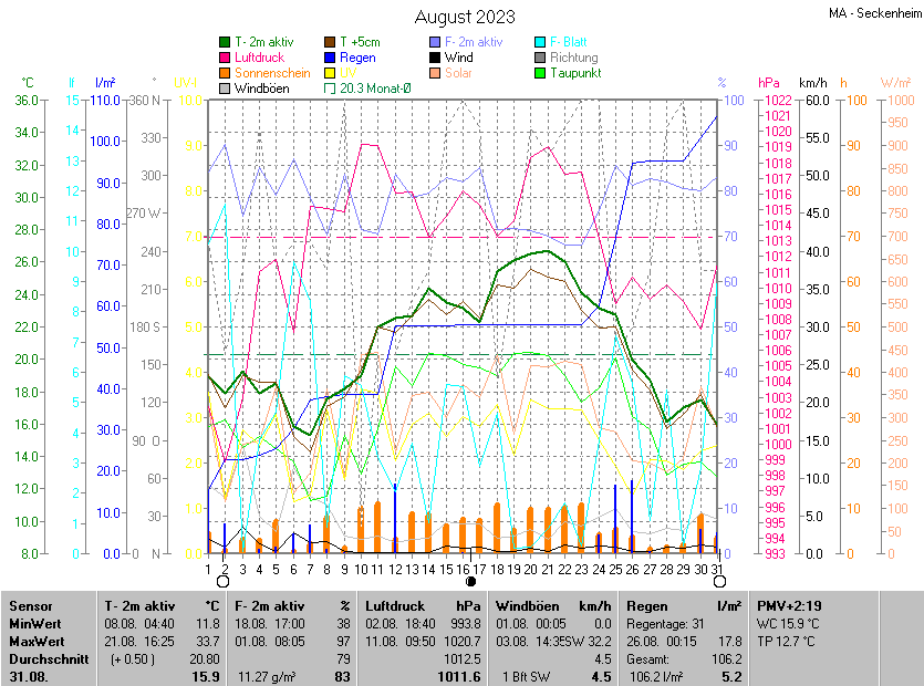 Die Durchschnittstemperatur für den Monat August 2023 lag bei 20.80°C. Die Abweichung vom langjährigen Mittel war +0.50°C.