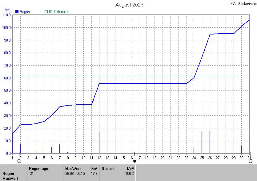 Die gesamte Regenmenge lag bei 106.2l/m² (entspricht: 172.1%) und war damit um +44.5l/m² vom langjährigen Wert entfernt. Niederschlag gab es an 16Tagen. Mehr als 2mm Regen gab es an 10Tagen. Sehr viel Regen mit mehr als 20mm pro Tag gab es an 0Tagen.