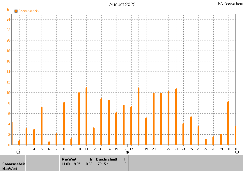 Dargestellt wird die grafische Übersicht für die Sonnenscheinzeit. Zu sehen sind immer die täglichen Sonnenstunden (von 0-24 Uhr):