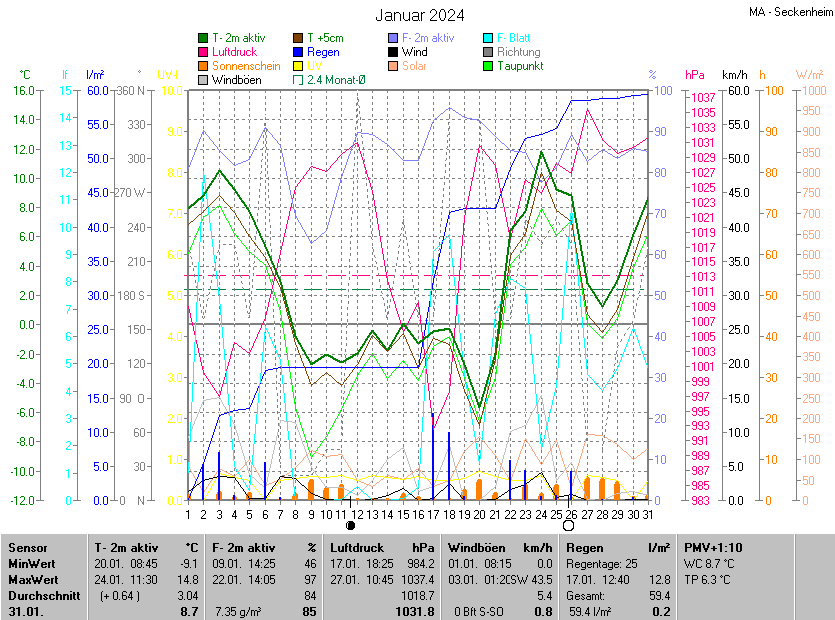Der wärmste Tag war der 24.01.2024 um 11:30 mit 14.8°C. Am kältesten war es mit -9.1°C am 20.01.2024 um 08:45.