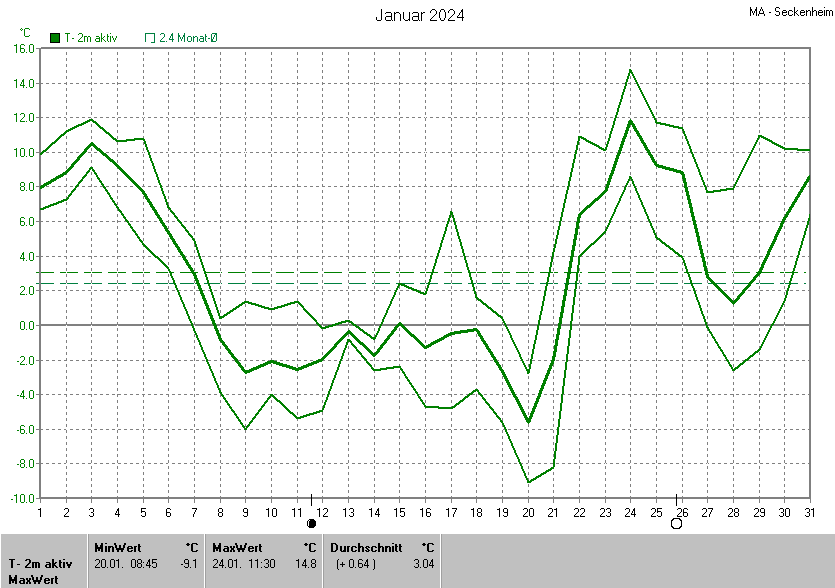 Die Durchschnittstemperatur für den Monat Januar 2024 lag bei 3.04°C. Die Abweichung vom langjährigen Mittel war +0.64°C.