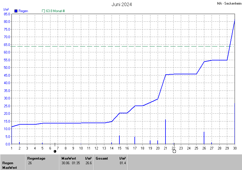 Die gesamte Regenmenge lag bei 81.4l/m² (entspricht: 127.6%) und war damit um +17.6l/m² vom langjährigen Wert entfernt. Niederschlag gab es an 14Tagen. Mehr als 2mm Regen gab es an 8Tagen. Sehr viel Regen mit mehr als 20mm pro Tag gab es an 1Tagen.