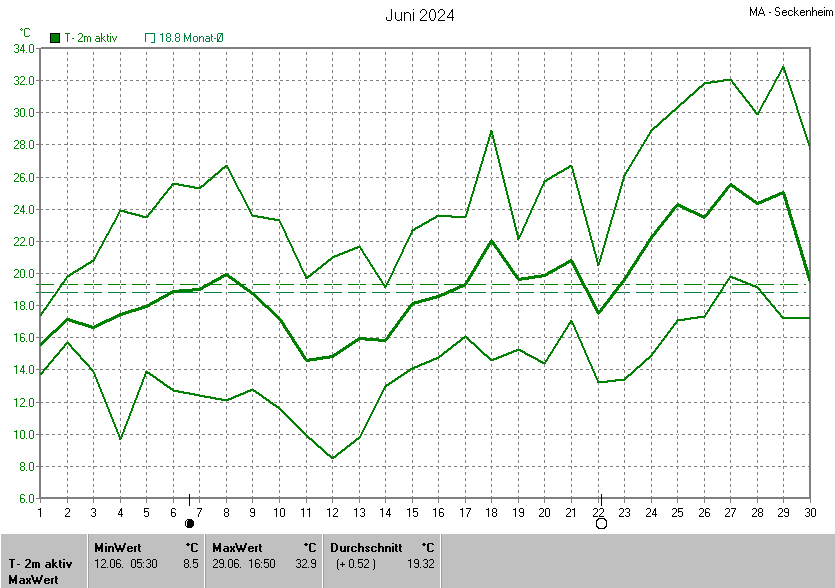 Der wärmste Tag war der 29.06.2024 um 16:50 mit 32.9°C. Am kältesten war es mit 8.5°C am 12.06.2024 um 05:30.