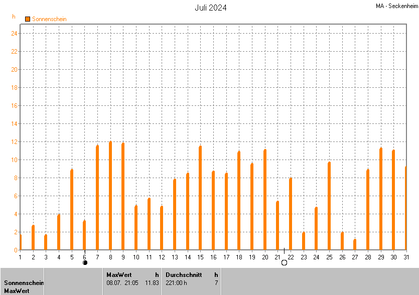 Dargestellt wird die grafische Übersicht für die Sonnenscheinzeit. Zu sehen sind immer die täglichen Sonnenstunden (von 0-24 Uhr):