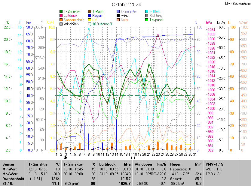 Die Durchschnittstemperatur für den Monat Oktober 2024 lag bei 12.63°C. Die Abweichung vom langjährigen Mittel war +1.73°C.