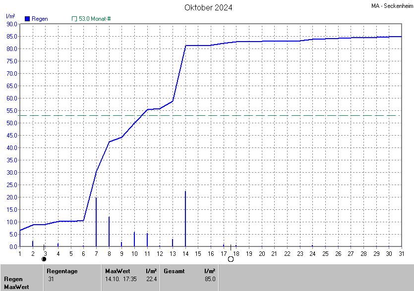 Die gesamte Regenmenge lag bei 85.0l/m² (entspricht: 160.4%) und war damit um +32.0l/m² vom langjährigen Wert entfernt. Niederschlag gab es an 25Tagen. Mehr als 2mm Regen gab es an 8Tagen. Sehr viel Regen mit mehr als 20mm pro Tag gab es an 1Tagen.