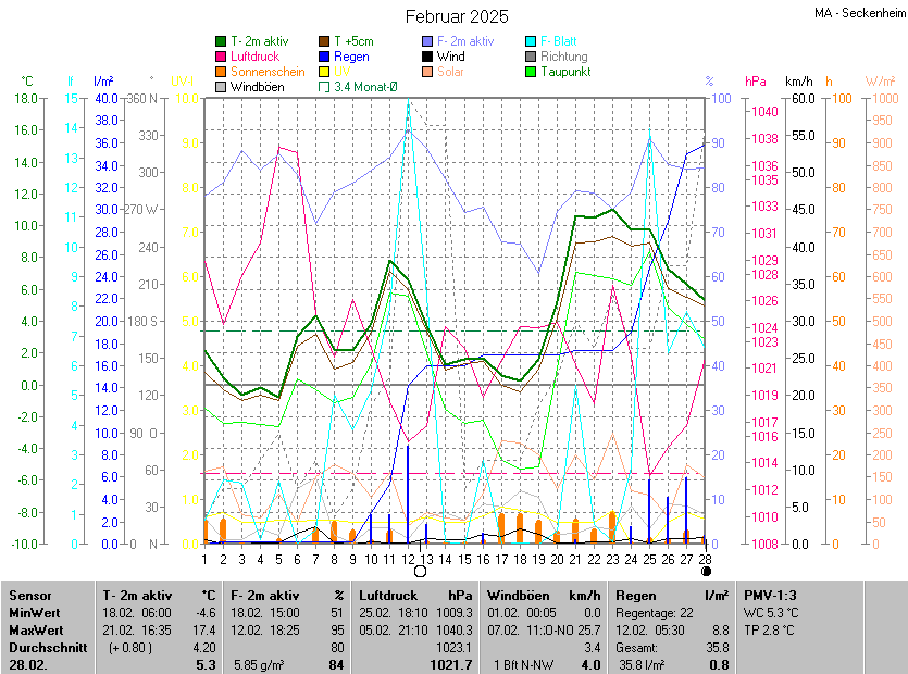 Der wärmste Tag war der 21.02.2025 um 16:35 mit 17.4°C. Am kältesten war es mit -4.6°C am 18.02.2025 um 06:00.