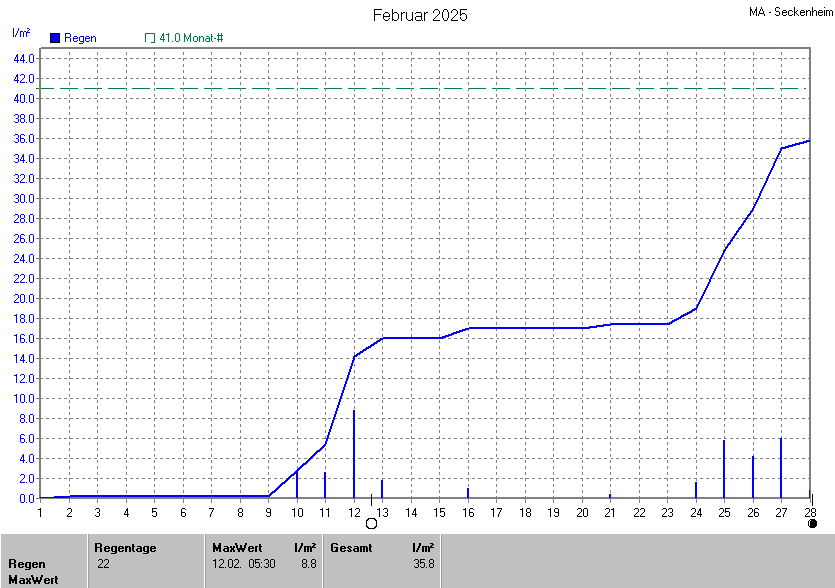 Die gesamte Regenmenge lag bei 35.8l/m² (entspricht: 87.3%) und war damit um -5.2l/m² vom langjährigen Wert entfernt. Niederschlag gab es an 12Tagen. Mehr als 2mm Regen gab es an 6Tagen. Sehr viel Regen mit mehr als 20mm pro Tag gab es an 0Tagen.