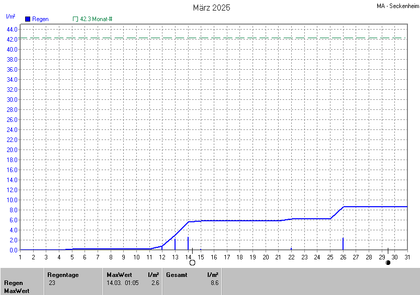 Die gesamte Regenmenge lag bei 8.6l/m² (entspricht: 20.3%) und war damit um -33.7l/m² vom langjährigen Wert entfernt. Niederschlag gab es an 7Tagen. Mehr als 2mm Regen gab es an 3Tagen. Sehr viel Regen mit mehr als 20mm pro Tag gab es an 0Tagen.