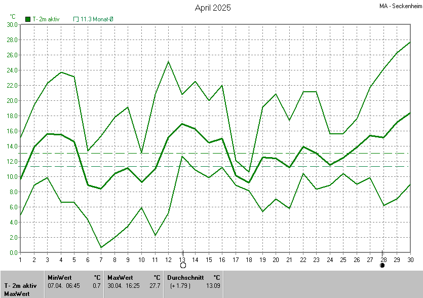 Der wärmste Tag war der 30.04.2025 um 16:25 mit 27.7°C. Am kältesten war es mit 0.7°C am 07.04.2025 um 06:45.
