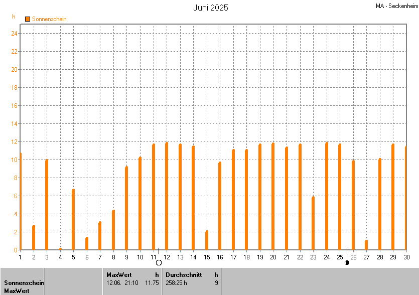 Dargestellt wird die grafische Übersicht für die Sonnenscheinzeit. Zu sehen sind immer die täglichen Sonnenstunden (von 0-24 Uhr):