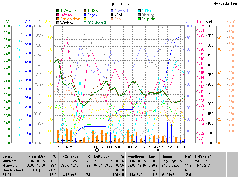 Die Durchschnittstemperatur für den Monat Juli 2025 lag bei 21.19°C. Die Abweichung vom langjährigen Mittel war +0.49°C.