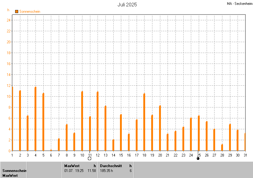 Dargestellt wird die grafische Übersicht für die Sonnenscheinzeit. Zu sehen sind immer die täglichen Sonnenstunden (von 0-24 Uhr):