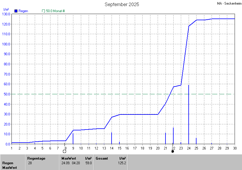 Die gesamte Regenmenge lag bei 125.2l/m² (entspricht: 250.4%) und war damit um +75.2l/m² vom langjährigen Wert entfernt. Niederschlag gab es an 18Tagen. Mehr als 2mm Regen gab es an 7Tagen. Sehr viel Regen mit mehr als 20mm pro Tag gab es an 1Tagen.