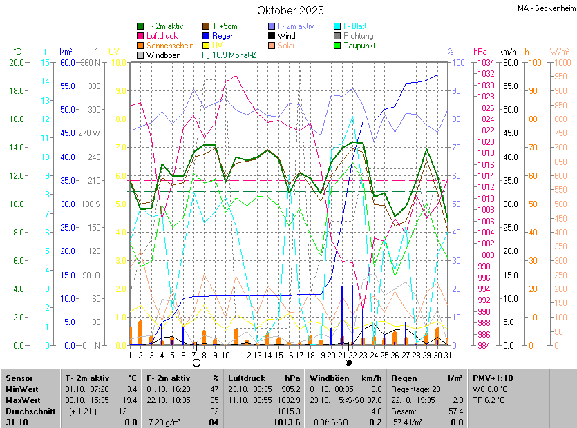 Der wärmste Tag war der 08.10.2025 um 15:35 mit 19.4°C. Am kältesten war es mit 3.4°C am 31.10.2025 um 07:20.