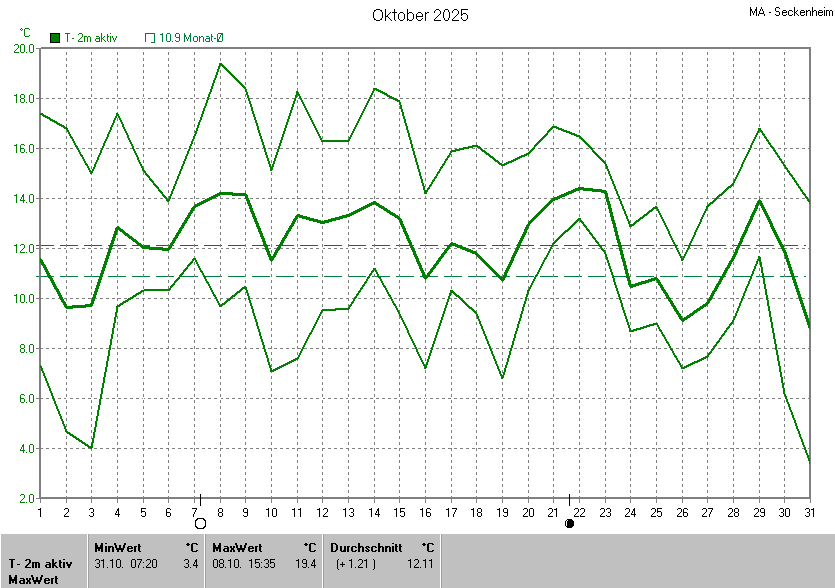 Die Durchschnittstemperatur für den Monat Oktober 2025 lag bei 12.09°C. Die Abweichung vom langjährigen Mittel war +1.19°C.